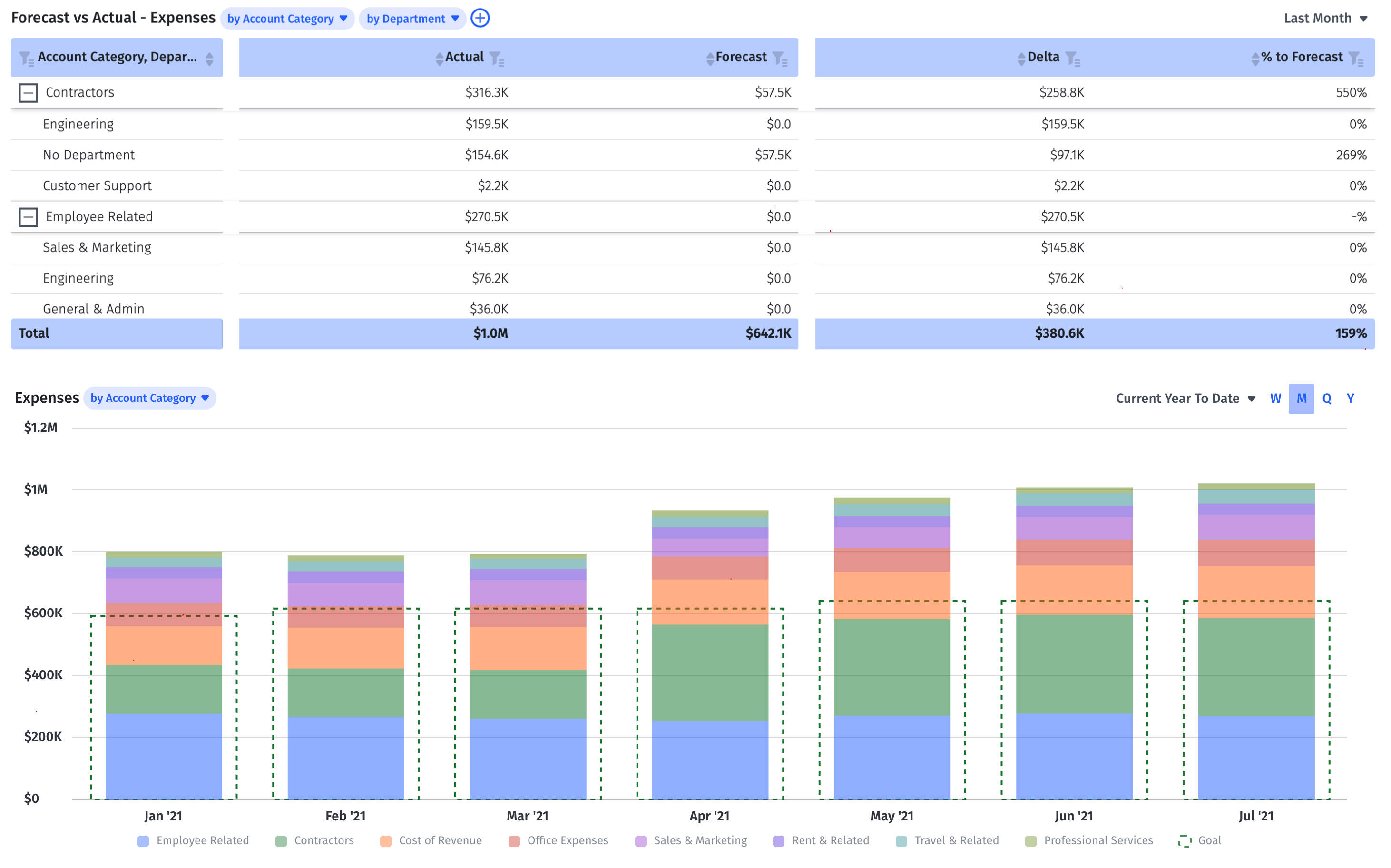 First and foremost, the dashboard needs to provide an accurate baseline of the company’s plan (whether that’s a rolling forecast or traditional budget). But it also needs to make it easy for finance to get granular with the data. That means breaking the data down to the department and account levels as necessary, like in the example below.