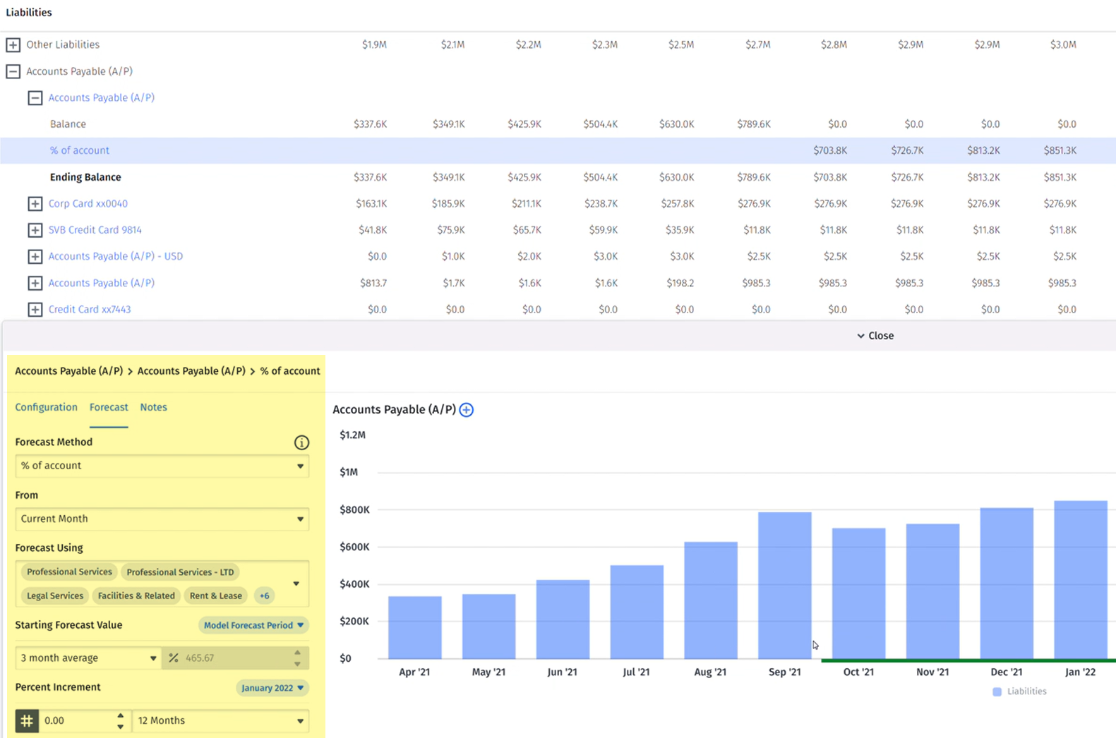 Here, you can see that we’re driving the accounts payable forecast by a three-month average of key income statement accounts that you historically pay via the AP process (professional services, rent, and sales and marketing). Applying that percentage forward means that as your expenses increase across those accounts, the overall AP account will increase accordingly.