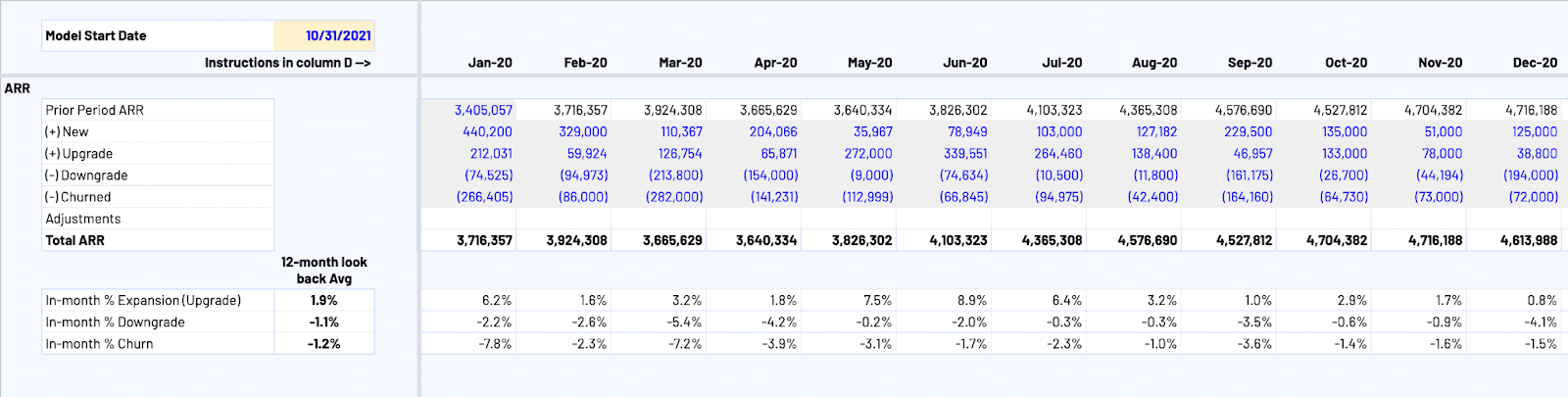 The second component of the ARR snowball model is the combination of upgrade, downgrade, and churned revenue. These are the assumptions that complete your picture of ARR: