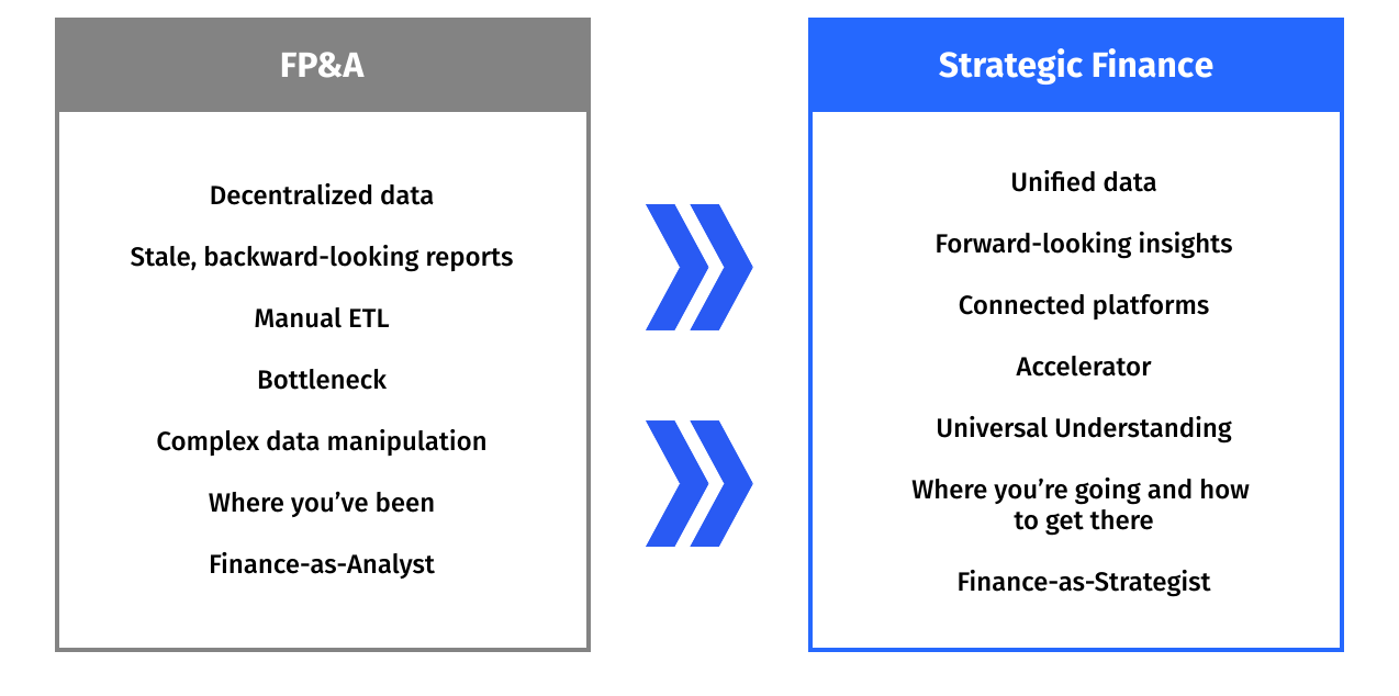 Building a strategic finance function flips the paradigm of traditional corporate finance on its head by leveraging the latest technology to free up time spent on low value, backward-looking tasks, so you can identify (and follow through on) opportunities to guide your business into the future.
