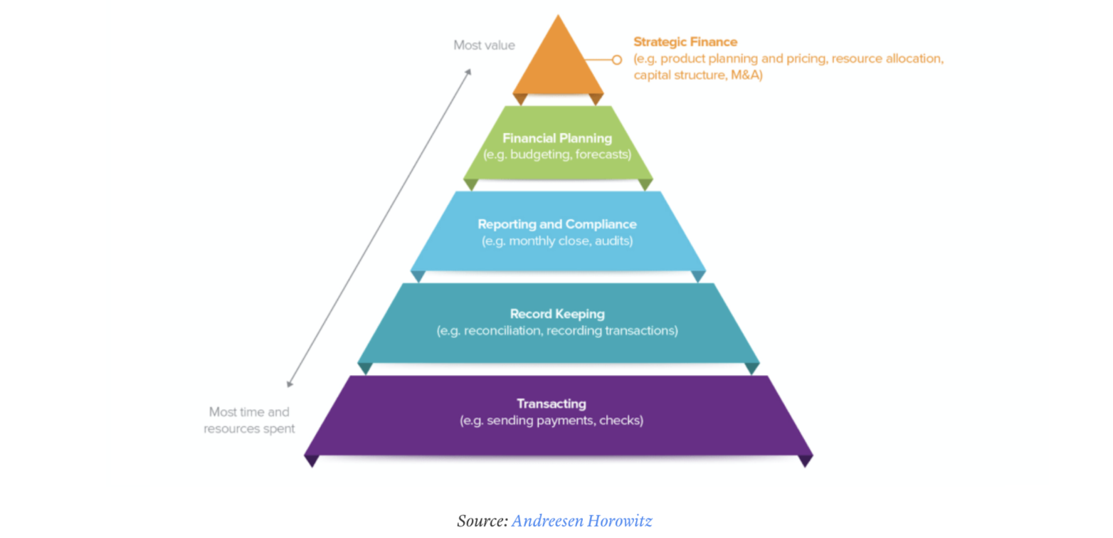 Andreesen Horowitz’s Seema Amble and Angela Strange used this pyramid to show that the typical CFO and their finance team aren’t able to focus on forward-looking tasks: