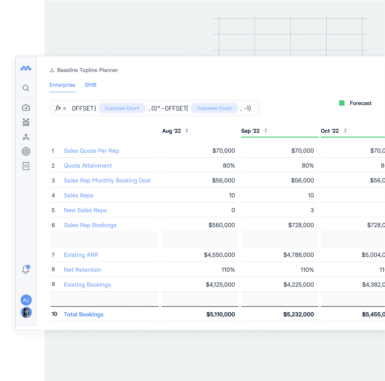 Build forecasts with dynamic modeling tools that allow teams to see the impact of driver changes in real-time. Show partners the dependencies of your assumptions and track them as you go so everyone is on the same page.